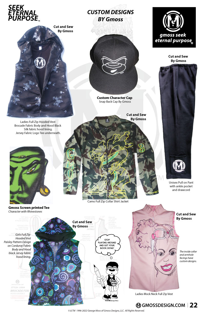 Professional Product Designs and technical fashion designs created by Gmoss. He can create ideas from concept to sketch to actual products. Gmoss has a strong technical background and keeps close attention to details while working on projects. This portfolio shows his original art, cartoon character designs, accessories, line sheets, and cut-n-sewn clothing designs. He creates from his fashion technical packages, Fashion Line Sheets, character designs, comic books, and his novel, The Chronicles of Ann & Lo, that he has published.